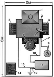 1- вентиляція; 2- робочий стіл; 3- ящик для електродів; 4- ящик для деталей; 5- діелектричний ковбик; 6- запальник; 7- газовий рукав; 8- стілець; 9- газовий балон; 10- прямий провід; 11- джерело живлення дуги; 12- заземлення; 13- зворотній провід; 14- ящик для відходів.
