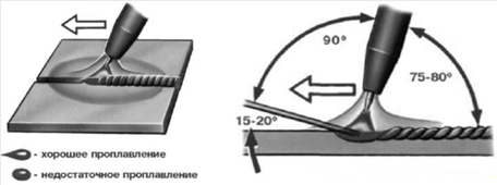 Здійснюють тільки один рух - уздовж осі шва. Відсутність поперечних коливань призводить до того, що шов стає вужчий, ніж при зварюванні покритими електродами. Щоб метал шва не насичувався киснем або азотом повітря, треба стежити, щоб кінець присадочного дроту і W-електрод постійно знаходився в зоні захисного газу. Щоб уникнути розбризкування металу кінець дроту подають у зварювальну ванну плавно. Про ступінь плавлення судять за формою ванни розплавленого металу. Хорошому проплавленню відповідає ванна, витягнута в бік напряму зварювання, а поганому - кругла або овальна. Зварювання зазвичай виконують справа наліво. При зварюванні без присадочного матеріалу електрод розташовують перпендикулярно до поверхні металу, що зварюється, а з присадним матеріалом під кутом. Присадний пруток переміщують попереду пальника без поперечних коливань (Рис.2.3).