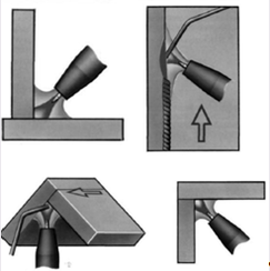 При зварюванні вертикальних швів електрод направляють точно в кут під нахилом до вертикальної площини. Присадний дріт подають зверху.