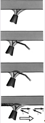 4. Розплавляють кінець дроту так, щоб під тиском зварювальної дуги розплавлений метал попадав у зварювальну ванну. У міру плавлення присадочного дроту формують зварний шов, для чого пальник переміщають уздовж з'єднання і знову подають присадний дріт у зону плавлення (Рис. 2.6).