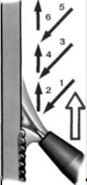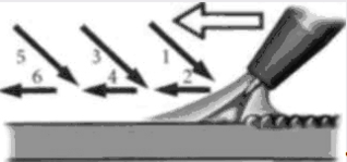 Без присадочного дроту зварюють кореневі шви товстих листів металу з обробленням країв. Металу кромок достатньо для формування шва. Стикові з'єднання листів тонкого металу зварюють з присадочним дротом, так як металу для формування шва не вистачає. Пальник розташовують під кутом до зварюваного виробу і переміщають її поступально без поперечних коливань, а присадний дріт подають по траєкторії 1-6 (Рис. 2.7).