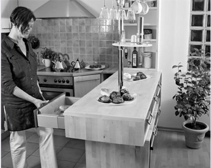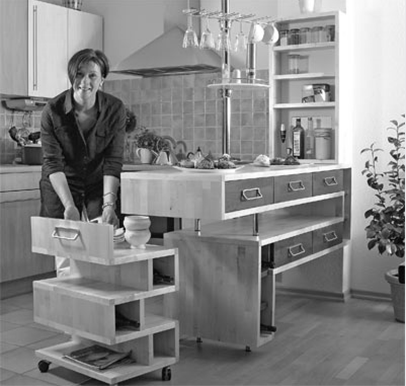Столик сервіровки зібраний з тих же меблевих щитів, що і стійка, і забезпечений колесами, завдяки яким може легко переміщатися по будь-якому підлоговому покриттю. Металеві ручки столика сервіровки і висувних ящиків барного столика вносять останні завершуючі штрихи до дизайну всієї композиції.