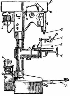 1 — електродвигун гідронасоса механізму подачі, 2 — електродвигун механізму різання. 3 — шпиндель, 4— затискувач, 5 — стіл, 6 — маховичок механізму переміщення стола, 7 — педаль.