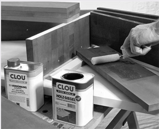 4. Потім фасади висувних ящиків за допомогою широкої кисті покривають морилкою з відтінком "під вишню". При збірці верхньої частини барної стійкі вертикальні елементи, що забезпечують жорсткість, фіксуються металевими затисками.