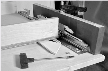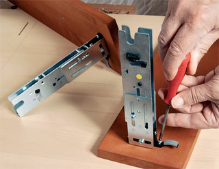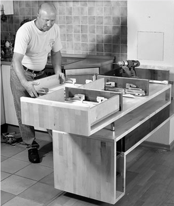 До фасадів ящиків кріплять металеву фурнітуру, що забезпечує рух по тих, що рейковим направляють. Зібравши всі ящики, перевіряють, наскільки легко вони ковзають по тих, що направляють, при цьому здійснюється точна підгонка.