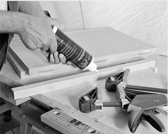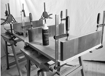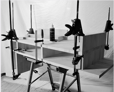 2. Вертикальні і горизонтальні елементи сполучають один з одним. Для цього пази заповнюють клеєм, і в них вставляють тонкі кріпильні пластини з дерева. Після висихання проклеєну поверхню меблевих деталей ретельно шліфують до абсолютної гладкості. Аби після збірки деталі столика сервіровки.