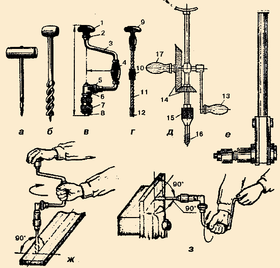 Для ручного свердління застосовують такі пристосування: бурав, коловорот, свердлилка, шестеренчастий дриль, тріскачка.
