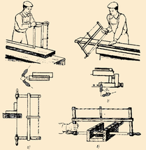 Рис. 5. Розпилювання дошок: а - повздовжнє, б - поперечне, в - поперечне і під кутом лучковою пилою в розпилювальному ящику