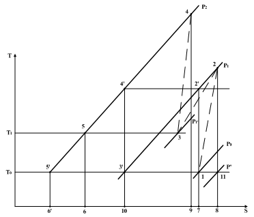 Процесс многоступенчатого сжатия с охлаждением в виде пилообразной линии в T,S - диаграмме на рис. 1.1. состоит из равновесных процессов, изоэнтропного сжатия и охлаждения до температуры окружающей среды при постоянном давлении. В реальных ступенях компрессора конечные скорости сжатия делают процесс неравновесным: возникают трение, вихревые и волновые явления. Часть энергии, подводимой к газу, из-за этого рассеивается и переходит в теплоту.