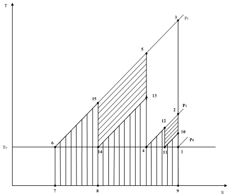 и конечного давления Р2 (рис. 1.2.) работу сжатия второй секции придётся увеличить как за счёт падения начального давления от Р1 до Р0 , так и за счёт повышения начальной температуры сжатия от То до Т1. Выделим ту часть суммарного увеличения работы сжатия, которая непосредственно связанна с неравновесностью процесса охлаждения. С этой целью представим удельную работу многосекционного компрессора в виде