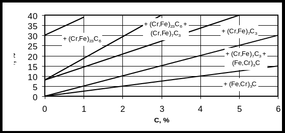 Рис.1. Сечение диаграммы состояния системы Fe – Cr – C при20оС [5]