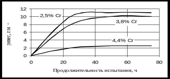 Наиболее заметное влияние на окалиностойкость, а следовательно, на износостойкость хром оказывает при содержании с 2,5 до 3,5–4% (рис. 2).