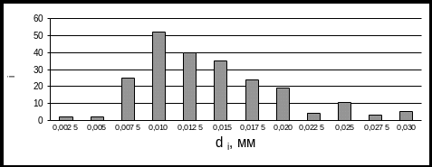 | № размерной группы | Размер хорд di, мм | Количество хорд данного размера ni | Относительная доля длин хорд по данной группе, % | ||