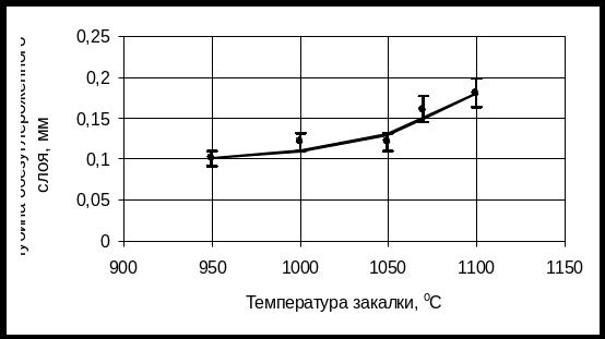 На приведенных графиках (рис. 24–28) видно, что глубина обезуглероженного слоя при температуре нагрева под закалку 950°C достигает 0,10 мм, при 1 000°C – 0,12 мм, при 1 050оС – 0,12 мм, при 1 070оС – 0,16 мм и при 1 100оС – 0,18 мм. Зависимость глубины обезуглероживания от температуры закалки представлена на рис. 29.
