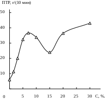 Рис.3.10. зависимость показателя текучести расплава образцов исходного ПЭ (2 партия материалов) от содержания крахмала.