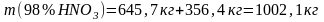 Для проведения реакции требуется 1002,1кг моногидрата азотной кислоты, тогда общее количество моногидрата азотной кислоты, необходимое для проведения реакции нитрования составит: