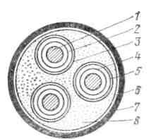 Рис. 1. Силовий трьохжильний кабель із паперовою просоченою ізоляцією: