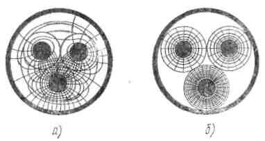 Електричне поле змінної напруги в ізоляції кабелю з окремими металевими оболонками (рис. 3, б) на кожній із трьох жил діє поперек шарів кабельного паперу й не поширюється за межі оболонок. Тому така конструкція кабелю надійніше, особливо при напрузі 20 й 35 кВ, де застосування кабелів з поясною ізоляцією не передбачено діючими стандартами й технічними умовами.