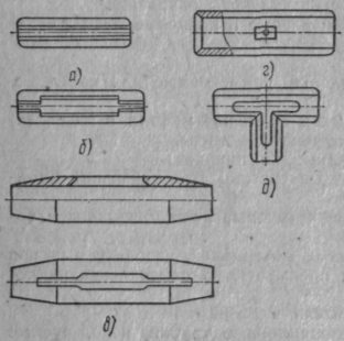 Рис. 9. Сполучні (а - для кабелів перетином до 10 мм2, б- для кабелів перетином 10-240 мм2, в - для кабелів напругою 20 й 35 кВ, г - закріплювана опресуванням) і відгалужена нероз'ємна (д) гільзи