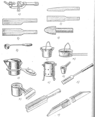а - ніж НКА-1м, б - разбортовка, в - рубель, г - шаблон, д - ложка, е - тигель, ж - ківш, з - кабельне цебро, і - жаровня, К - лійка, л - мішалка, м - лоток, н – шкребок