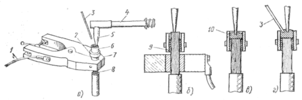 а - кінець жили, підготовлений до сплавки, б - початок сплавки, е - утворення зварювальної ванни, г - введення присадочного матеріалу; 1 - провід, 2 - бандаж, 3 - присадочний матеріал, 4 - електродотримач, 5 - вугільний електрод, 6 - зварювальна форма, 7 - охолоджувач, 8 - жила, 9 - підмотування азбестовим шнуром, 10 - зварювальна ванна