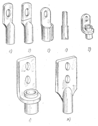 а й б - алюмінієві (мідні) і мідно-алюмінієві, що закріплюють опресуванням, в - мідні, що закріплюють пайкою, г - мідно-алюмінієві штифтові, що закріплюють обпресуванням, д, е і ж - з алюмінієвого сплаву ЛА й ЛАС, що закріплюють зварюванням