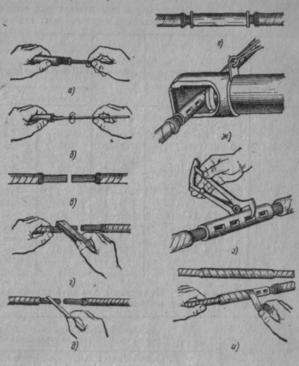 а - зачищення внутрішньої поверхні гільзи, б - змащення внутрішньої поверхні гільзи, в - кінці жил зі знятою ізоляцією, г - зачищення кінців жил, д - змащення жив кварцевазелиновою пастою, е - надягання гільзи на жили, ж - обпресування гільзи, з - вимір залишкової товщини в місці опресування, і - готове з'єднання