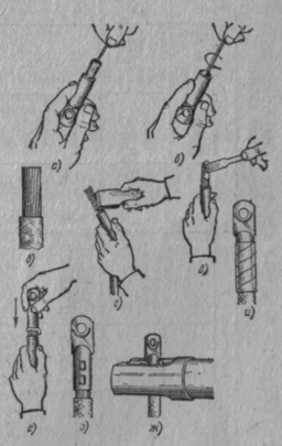 Для окінцювання й з'єднання алюмінієвих жил застосовують стандартні кабельні наконечники ТА (алюмінієві) і ТАМ (мідно-алюмінієві), шрифтові ШП (мідно-алюмінієві) і сполучні алюмінієві гільзи ГА, для окінцювання й з'єднання мідних струмопровідних жил - стандартні кабельні наконечники Т і сполучні гільзи ГМ. Для створення зусиль, необхідних при обпресуванні, використають різноманітні механізми. Послідовність окінцювання й з'єднання алюмінієвих жил показана на рис. 5, а-і й 6, а-і.