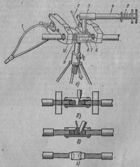 а - установка жили встик, б - початок зварювання, в - сплавка присадочного матеріалу, г - готове з'єднання; 1 - провід, 2 - присадочний матеріал, 3 - вугільний електрод, 4 - електродотримач, 5 - пружина, 6 - кінець жили, очищений від ізоляції, 7 - зварювальна форма, 8 - зварювальні кінці жил, 9 - азбестове підмотування, 10 - охолоджувач