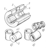 Для термітно-муфельного зварювання алюмінієвих жил кабелів застосовують термопатрони різних конструкцій. Термітний патрон ПА (рис. 12, а) призначений для з'єднання встик алюмінієвих жил перетином 16-800 мм2 і приварки наконечників ЛАС на жилах перетином 300-800 мм2. Він складається із циліндричного муфеля 1, сталевої формочки 3 (кокілі) і двох алюмінієвих ковпачків 4 або втулок. Муфель має наскрізний отвір по поздовжній осі для введення зварювальних жил кабелів і ливниковий отвір 2 для спостереження за процесом зварювання й введення присадочного матеріалу. Кокіль усуває безпосередній контакт жил кабелю з термітною масою муфеля, що підвищує якість зварювання. При зборці патрона отвори в кокілі й муфелі сполучають. Алюмінієві ковпачки або втулки захищають бічні поверхні жил від підплавлення. Ковпачки, що надягають на багатодротові жили (рис. 13, б, г), виконують також роль бандажів. Для круглих жил перетином 300-800 мм2 застосовують розрізні циліндричні втулки, для зварювання секторних однодротових жил - втулки з отворами за формою перетину жил (рис. 13, в). Термітні патрони вибирають по макророзмірах залежно від перетину жил. Для термітного зварювання застосовують набори приналежностей НТС-2М, НТС-3 або НСПУ.
