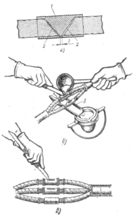 При пайці поливом виконують наступні технологічні операції. З кінців жил кабелю знімають ізоляцію з таким розрахунком, щоб між ізоляцією й формою (гільзою) залишався проміжок в 10 мм. Жилам, що з'єднують, надають круглу форму. У спеціальному шаблоні кінці жил обрізають під кутом 55° ножівкою (рис. 16, а). Кінці жил можуть бути підготовлені й з попереднім східчастим обробленням й обслуговуванням.