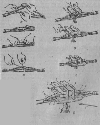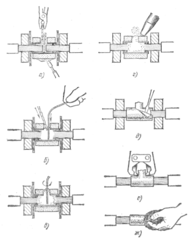 З'єднання й відгалуження алюмінієвих, багатодротових жил безпосередньою сплавкою припою (рис. 17) роблять із дотриманням наступної технології. Після видалення ізоляції на довжині 50, 60 або 70 мм відповідно для жил перетину 16-35, 50-95 й 120-150 мм2 виконують східчасте оброблення по повівам (рис. 17, а). Полум'ям газового пальника кінці жил нагрівають до температури плавлення припою, а потім, видаляючи оксидну плівку, на всю поверхню кінця жили наносять шар припою й ретельно розтирають його металевим пензликом (рис. 17, б) до повного обслуговування східчастої поверхні. Установлюють форми (рис. 17, г, д), у які вводять кінці жил. Для запобігання витікання припою в момент пайки простір між жилою й формою ущільнюють азбестовим шнуром (рис. 17, в).