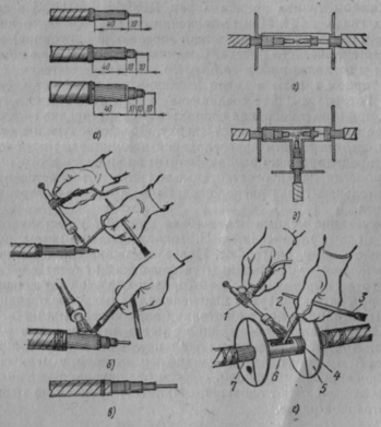 а - підготовка кінців багатодротових жил, б - лудіння кінців жил, в - підмотування азбестового шнура, г - установка форми для з'єднання, д - установка форми для відгалуження, е - сплавка припою; 1 - газовий пальник, 2 - паличка припою, 3 - сталевий пензлик, 4 - підмотування зі шнурового азбесту, 5 - захисний екран, 6 - форма, 7 - струмопровідна жила