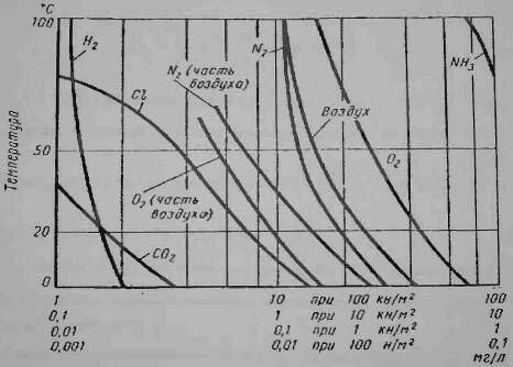 Но влажный воздух, кроме водяного пара, содержит воздух, который откачивается вакуумным насосом. Для оценки количества газов, растворенных в материале, можно воспользоваться данными, приведенными на рис.2, на котором представлены кривые растворимости газов в воде.