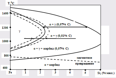 Рис. 7. Влияние содержания углерода на положение фазовых областей , + , для сплавов железо-кремний