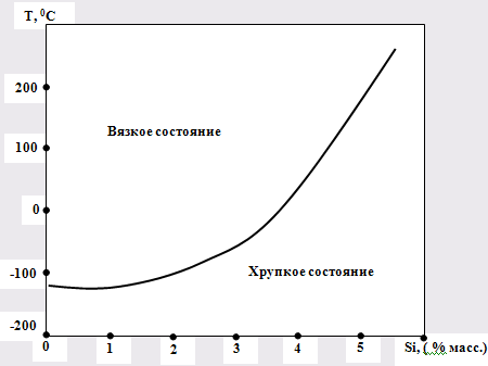 Рис. 6. Влияние состава на температуру перехода из вязкого состояния в хрупкое для сплавов железо-кремний