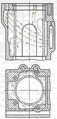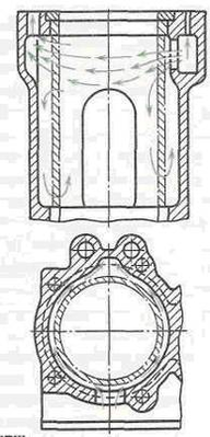 Основное отличие этой схемы заключается в наличии кольцевой щели с радиальной шириной (0,03–0,04) D, которая является верхней частью полости охлаждения. Данная схема обеспечивает допустимый уровень температур во втулке (150–160 °С) при форсировании дизелей до 22,5 кВт/л, а также более равномерное распределение температур по длине и периметру гильзы.