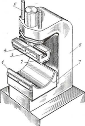 Подушка 7 закреплена на сварной станине 6 пресса. Нагрузку на деталь прикладывают через верхнюю подушку 3 с войлочной прокладкой 2, которая подвешена при помощи Т-образного паза к грибку плунжера 4 так, что может