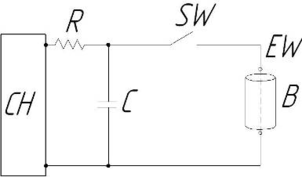 СH – источник питания для зарядки конденсатора; R – резистор; C – конденсатор; SW – выключатель; EW – металлическая проволока; B – напыляемая гильза