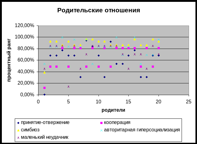 При диагностике родительского отношения с помощью теста-опросника (А.Я. Варга, В.В. Столин) определяется тот или иной вид отношения по шкале, в которой набирается из ответов наибольший процентный ранг по всем ответам родителей (диаграмма №1). По общим данным можно увидеть, что самый высокий процент 65% по шкале «симбиоз» (диаграмма №2).