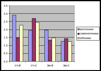 Группа эйтоников в нашем исследовании с физиологической точки характеризуется средними по отношению к симпатотоникам и ваготоникам показателями уровня функциональных резервов и степени напряжения регуляторных механизмов. Для эйтоников характерен высокий уровень напряжения регуляторных систем, когда повышенный расход ресурсов (за счет высокой активности симпатической нервной системы) не восстанавливается даже за счет высокого уровня их накопления (за счет повышенной активности парасимпатической нервной системы). Обе группы, по сравнению с ваготониками, характеризуются высокими показателями саморегуляции. При этом для эйтоников характерна большая вариативность показателей саморегуляции, что зависит от особенностей вегетативного баланса и свойств темперамента.