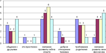 | Желание проявить себя в спорте | 4 | 5 | 6 | 4 | 19 |