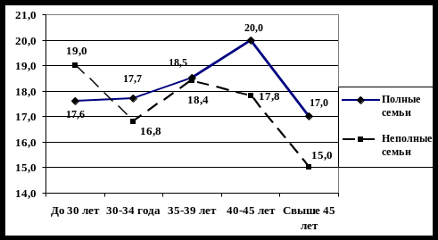 В меньшей степени уравнивают отношения между собой и ребенком родители: в полных семьях – старше 45 лет (17) и в неполных – также старше 45 лет, но показатель несколько ниже (15). В целом, в полных семьях наблюдается повышение показателей у родителей до 30 – 45 лет, затем резкое снижение у родителей старше 45 лет. В неполных семьях показатель постоянно меняется: то повышается, то снижается на 1-2,5 балла.