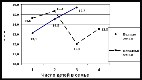 В полных семьях наблюдается стабильное повышение чрезмерной заботы с увеличением количества детей в семье (13,1 – 15,7). В неполных семьях – постоянное изменение этого признака: более высоки показатели в семьях с 2 детьми (15,3), более низкие – в семьях, где воспитывается 3 детей (12).