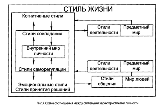 Данная схема может быть проинтерпретирована следующим образом. Каждый человек имеет дело с тремя мирами: миром предметов, в который для простоты суждения придется отнести также мир природы, миром людей и собственным внутренним миром. Взаимодействие с объектами в каждом из этих миров приводит к формированию устойчивых приемов и способов поведения разной степени обобщенности. Наиболее просто соотносятся стили деятельности с предметным миром и стили общения с миром людей.