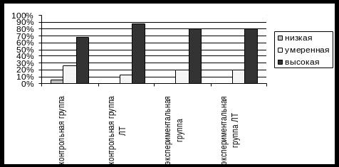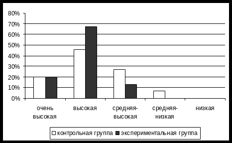 Как и в предыдущей методике только один человек контрольной группы имеет средний показатель тревожности с тенденцией к низкой. Подавляющее большинство в обеих группах имеют высокий уровень тревожности (7 человек – в контрольной, 10 человек – в экспериментальной). Очень высокий уровень тревожности имеют по 3 человека в каждой группе.