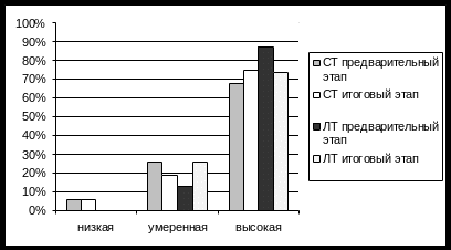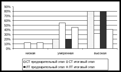 Как видно из рисунка 3.4, в контрольной группе ситуативная тревожность выросла, а личностная уменьшилась, но незначительно. Низкая ситуативная тревожность наблюдалась у одного человека и на предварительном, и на итоговом тестировании.