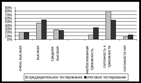 Результаты статистической обработки доказывают, что в контрольной группе уровень тревожности на конец исследования не понизился, в то же время в экспериментальной группе уровень тревожности значительно снизился.