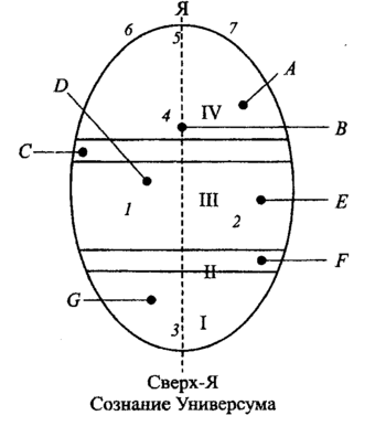I-IV — зоны перинатальных матриц; 1 — инстинкт самосохранения, 2 — инстинкт продолжения рода, 3 — инстинкт альтруизма, 4 — инстинкт творчества, исследовательский, 5 — инстинкт доминирования; 6 - инстинкт свободы, 7 — инстинкт сохранения достоинства; А — состояние включенного сознания: от логического анализа до сна и трансовых состояний; В— состояние сознания, при котором анализ скоординирован с индивидуальной волей и может проявиться в виде принятия решения, ответственности; С - уровень проявления эмоций в реальной жизни, легкие эмоциональные трансы (смех, плач, релаксация), возникающие как реакция на опыт взаимодействия с окружающим миром; D — уровень подсознания, психические функции, играющие роль буфера (фильтра) между сознанием и бессознательным; Е — вытесненный эмоциональный опыт, проявляющийся в психосоматических реакциях; зона сновидений, отражающих индивидуальный жизненный опыт, связанный с близкими людьми, семьей; F — зона перехода области индивидуального опыта (сознания) в область коллективного бессознательного; зона сновидений с потерей самоидентификации, с фантастическими образами и явлениями, архетипы, взаимодействие с которыми может привести к переживанию, как счастья, так и страха, ужаса; G — коллективное бессознательное, глубинная трансовая зона, состояние сознания, идентичное Сверх-Я.