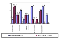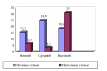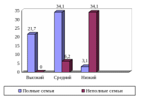 У детей из неполных семей преобладает заниженная самооценка (34,1%). Ребенок в этой ситуации оказывается психологически надломлен, он не доверяет окружающему миру, ему не хватает ощущения личностной ценности. Для детей с заниженной самооценкой характерны скромные цели и неуверенность в возможности их достижения. Таким образом, детям из неполных семей необходимо повышать уровень самооценки до адекватной, так как по мере формирования и укрепления самооценки возрастает способность к утверждению и отстаиванию своей жизненной позиции.